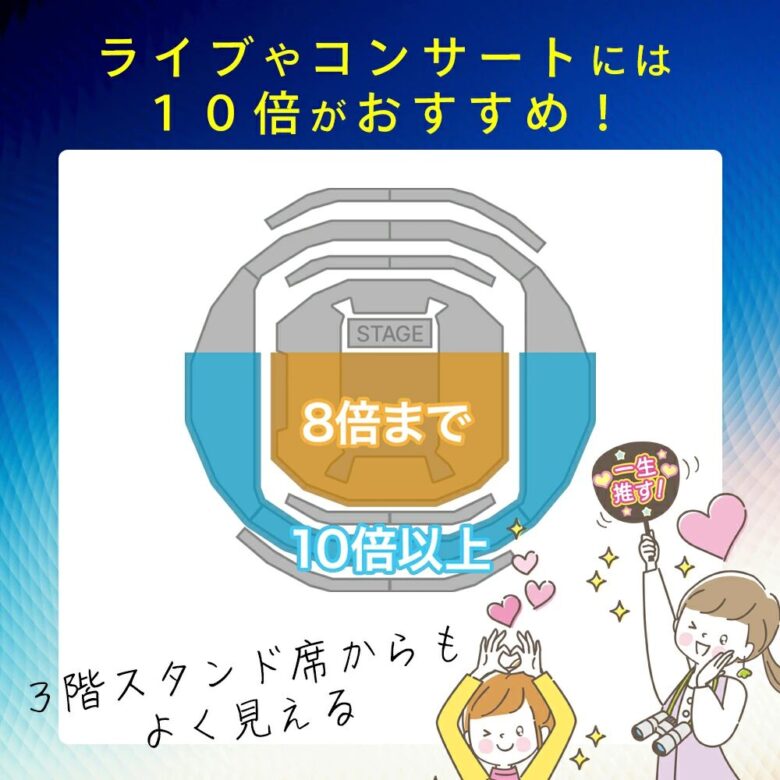 A. 10倍の倍率があるため、ドームのスタンド席からでも十分楽しめます。
