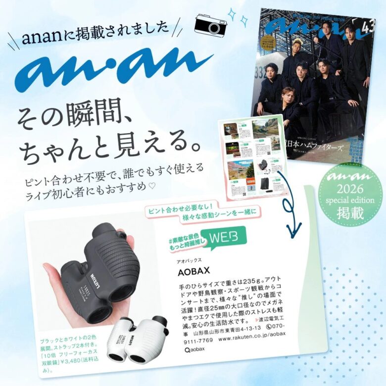 そんな切実なお悩みを一瞬で解決してくれるのが、人気雑誌『anan』の推し活特集にも掲載され、楽天ランキングでも1位を獲得した「AOBAX(アオバックス)双眼鏡」です。