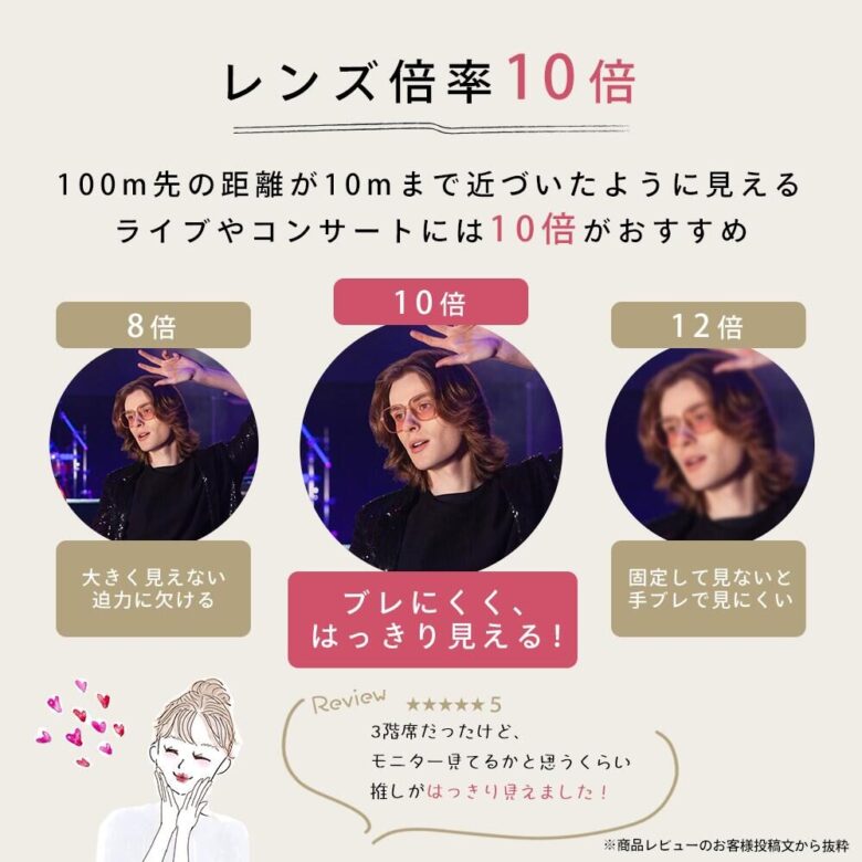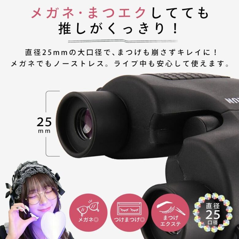 ライブ中、暗い客席でいちいちメガネを外して双眼鏡を覗く…という面倒な動作とおさらばできます!